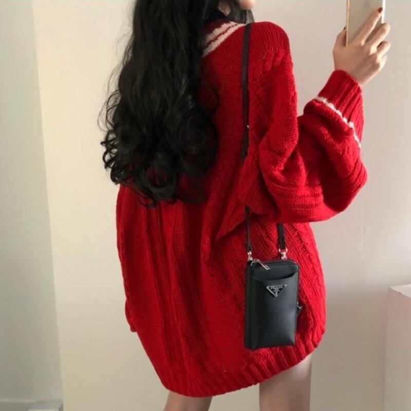 オータムウィンターカラーVネックカジュアルルーズニットプルオーバー セーター レディース 秋物 冬物 韓国婦人60774399196