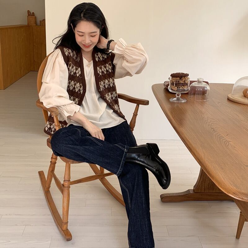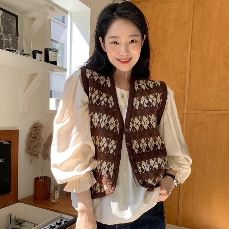 オータムウィンタースタンダードジャカードニットラウンドネックプリーツスリーブTシャツ シャツ レトロ 秋物 冬物 Oネック 韓国婦人98767762363