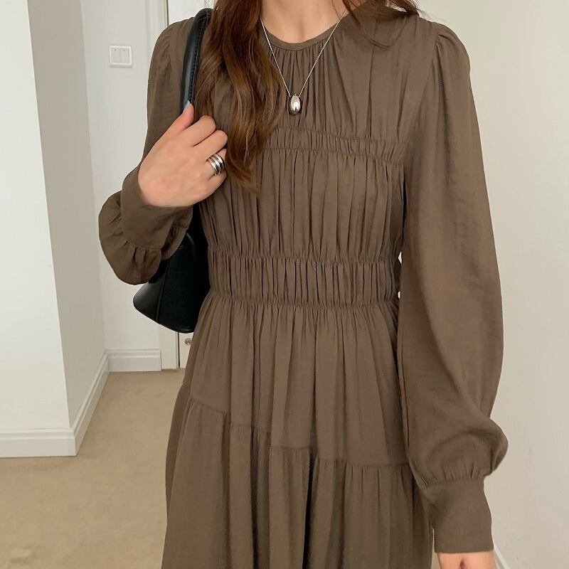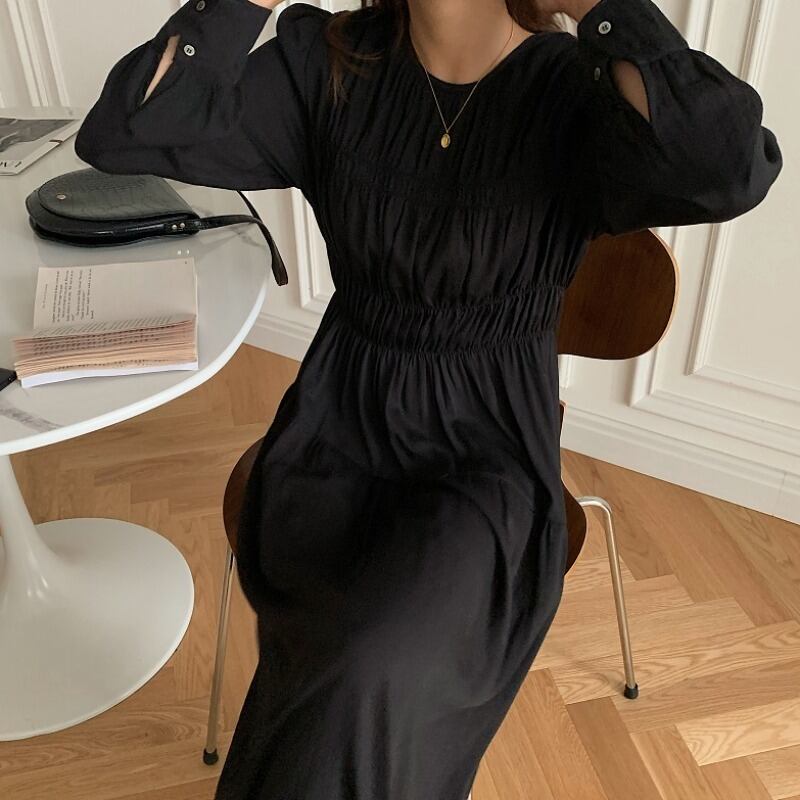 オータムウィンターラウンドネックウェストドレス レディース ロング 秋物 冬物 Oネック 韓国婦人97302623980