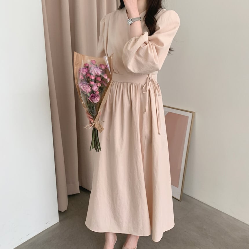 スプリングスタンダードミニマリストカラーストラップ ウェストドレス レディース ロング レトロ 春物 ピュア 韓国婦人28424457607