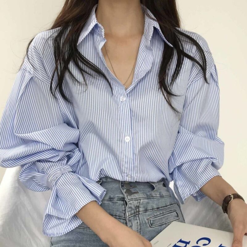 オータムスタイルカジュアルルーズスリーブストライプシャツ レディース レッド 秋物 韓国婦人45945145681