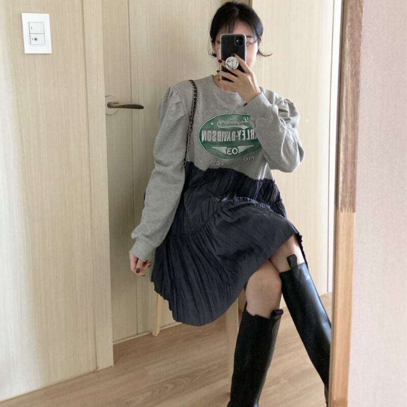 オータムウィンターラウンドネックカジュアルプリーツドレス セーター スカート レディース 秋物 冬物 Oネック ステッチ 韓国婦人45527673160