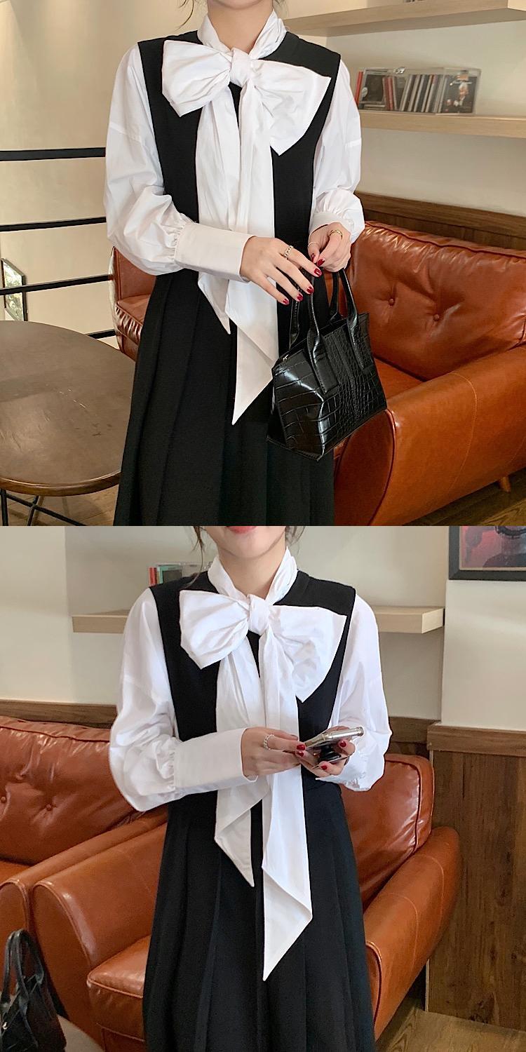 オータムウィンタースタイルロングプリーツスカート リボンシャツ 秋物 冬物 韓国婦人94896202142