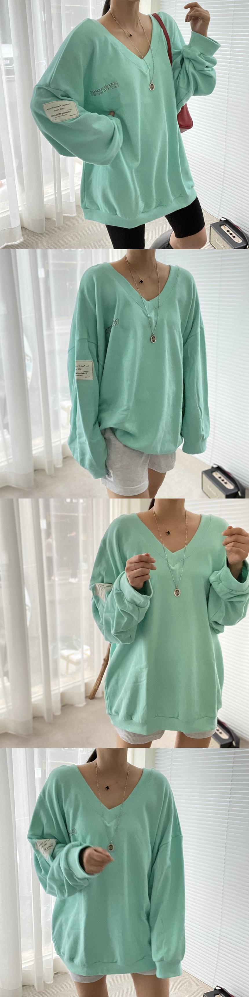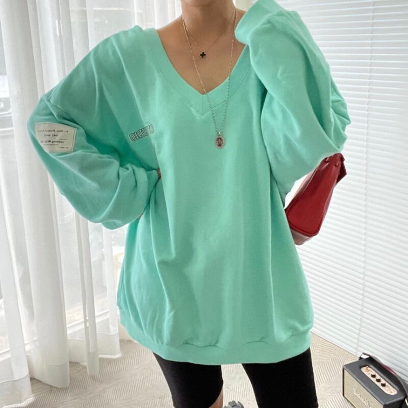 オータムウィンターカラーVネックプリントカジュアルルーズ薄手Tシャツ レディース 秋物 冬物 韓国婦人67176064208