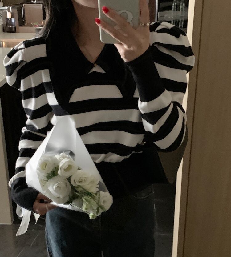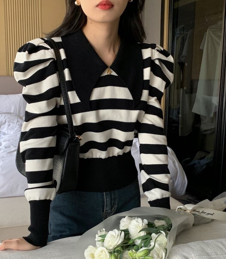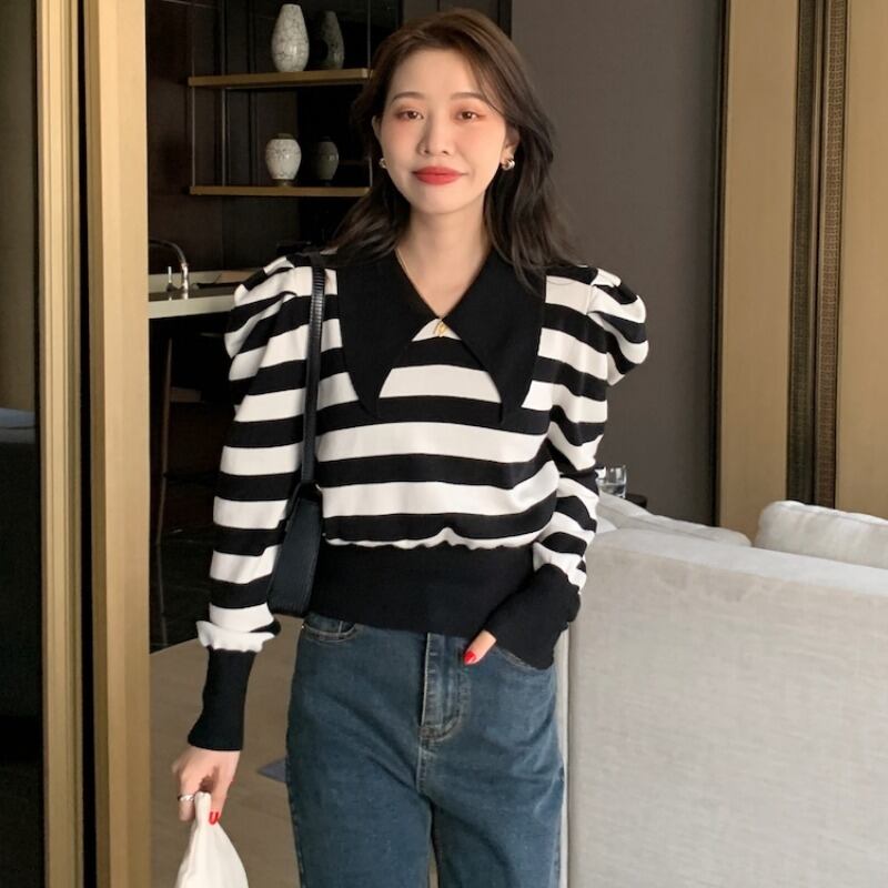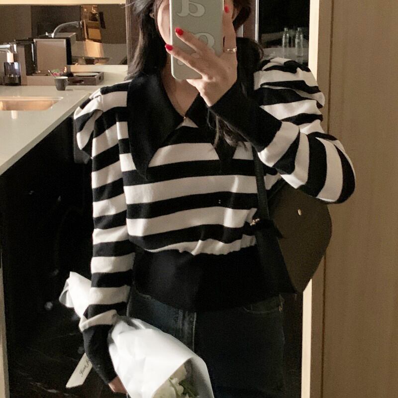 オータムウィンタースタンダードルーズスリーブショートストライプセーター レディース レトロ 秋物 冬物 韓国婦人95589748879