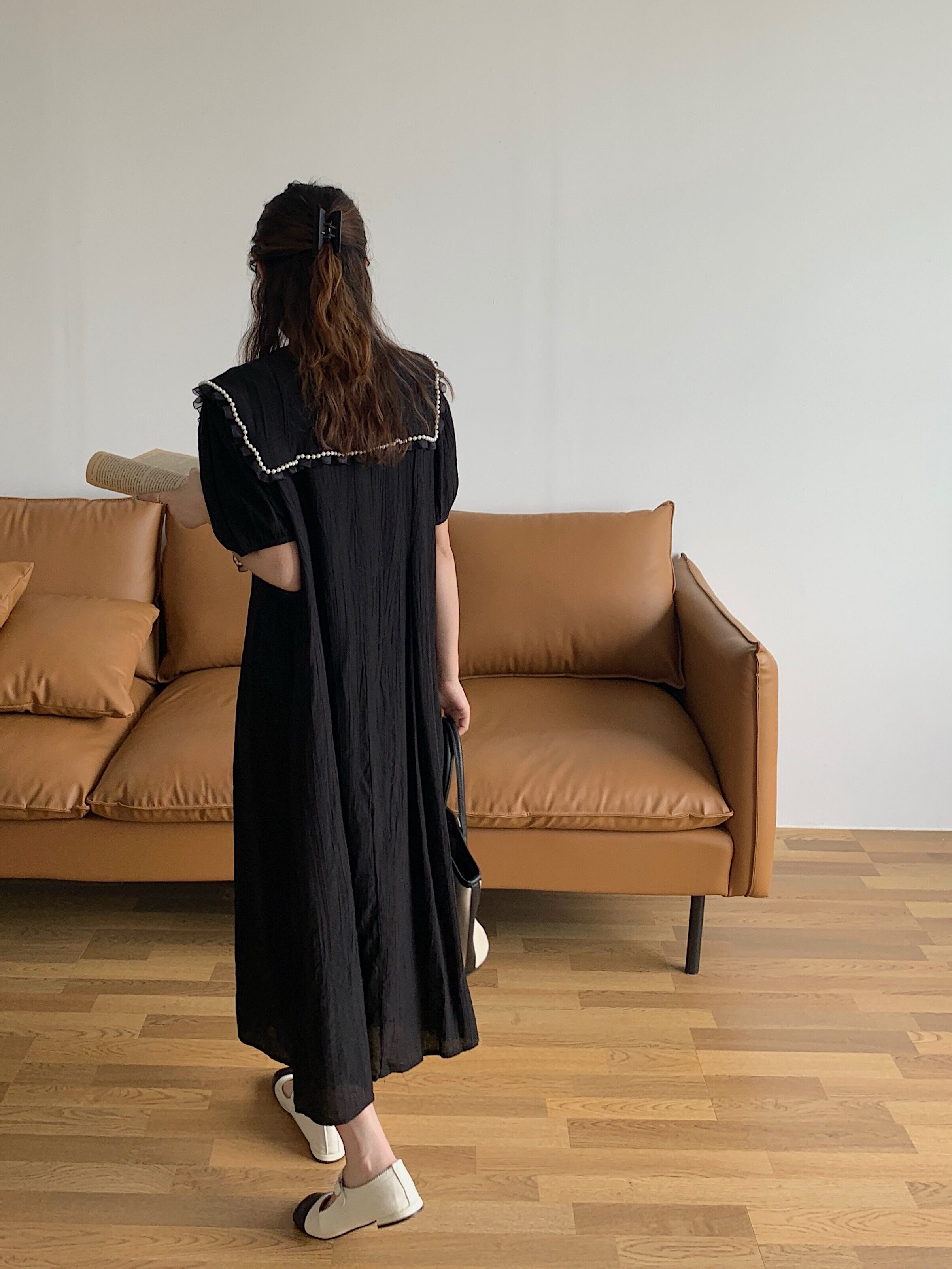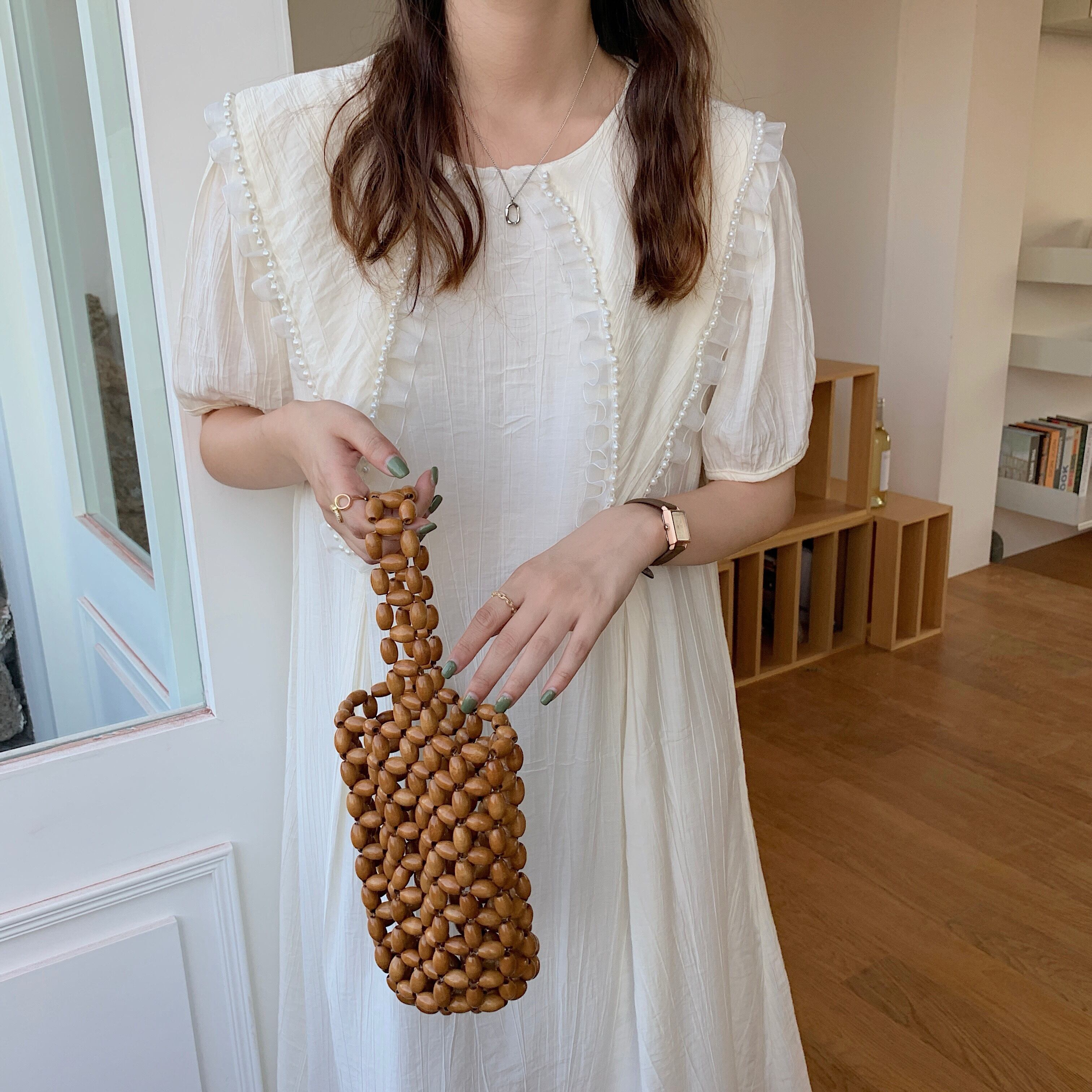 パールスタイルルーズスリーブドレス サマーロングスカート レース 大人ガーリー スウィート キュート カジュアル 夏物 真珠 韓国婦人2155366758