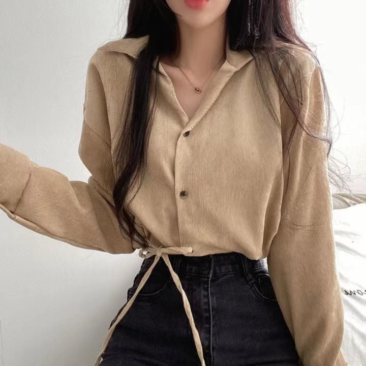 オータムウィンターソリッド カラーコーデュロイシャツ トップス レディース ロング レース 秋物 冬物 レースアップ ソリッドカラー 韓国婦人41208361068