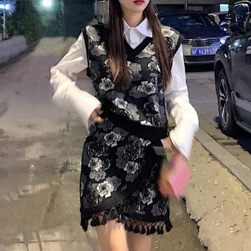 オータムスタンダードジャカードVネックニットハイウェストウェストスカート レディース レトロ 秋物 韓国婦人79189620127