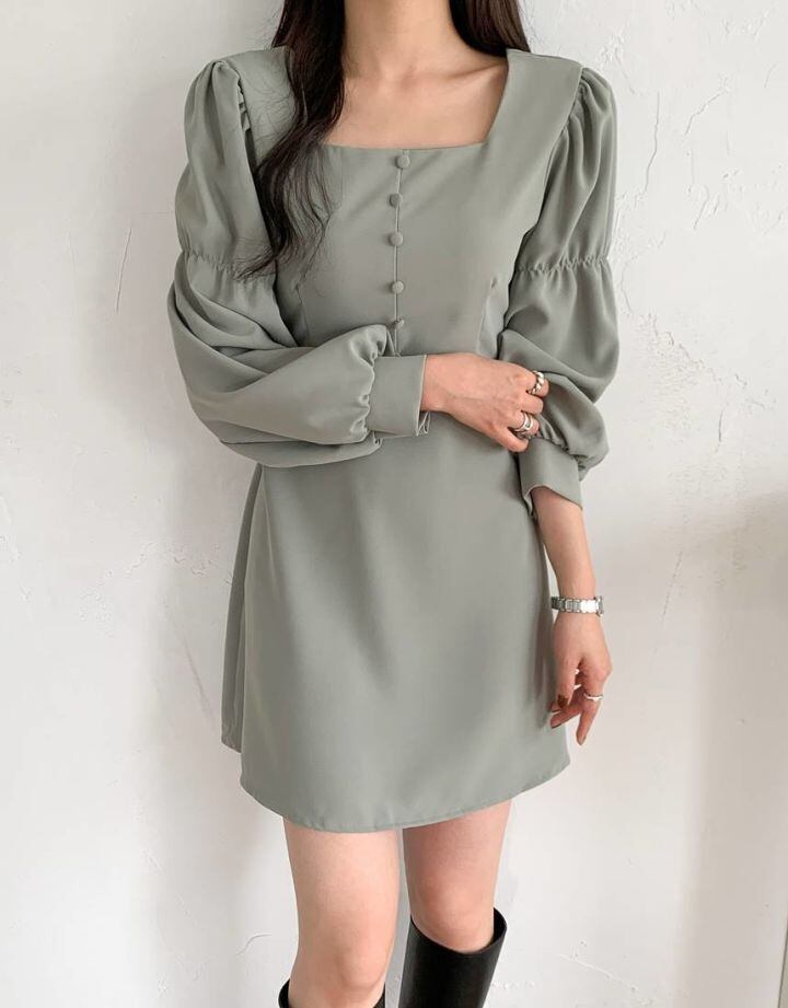 オータムスタンダードカラーウェストスリーブドレス レディース レトロ 秋物 スクウェア 韓国婦人14390814287