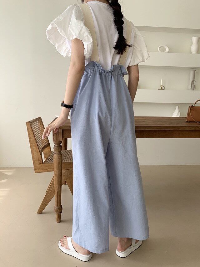 色:ホワイトパフスリーブトップ,黒いズボン,青パンツ