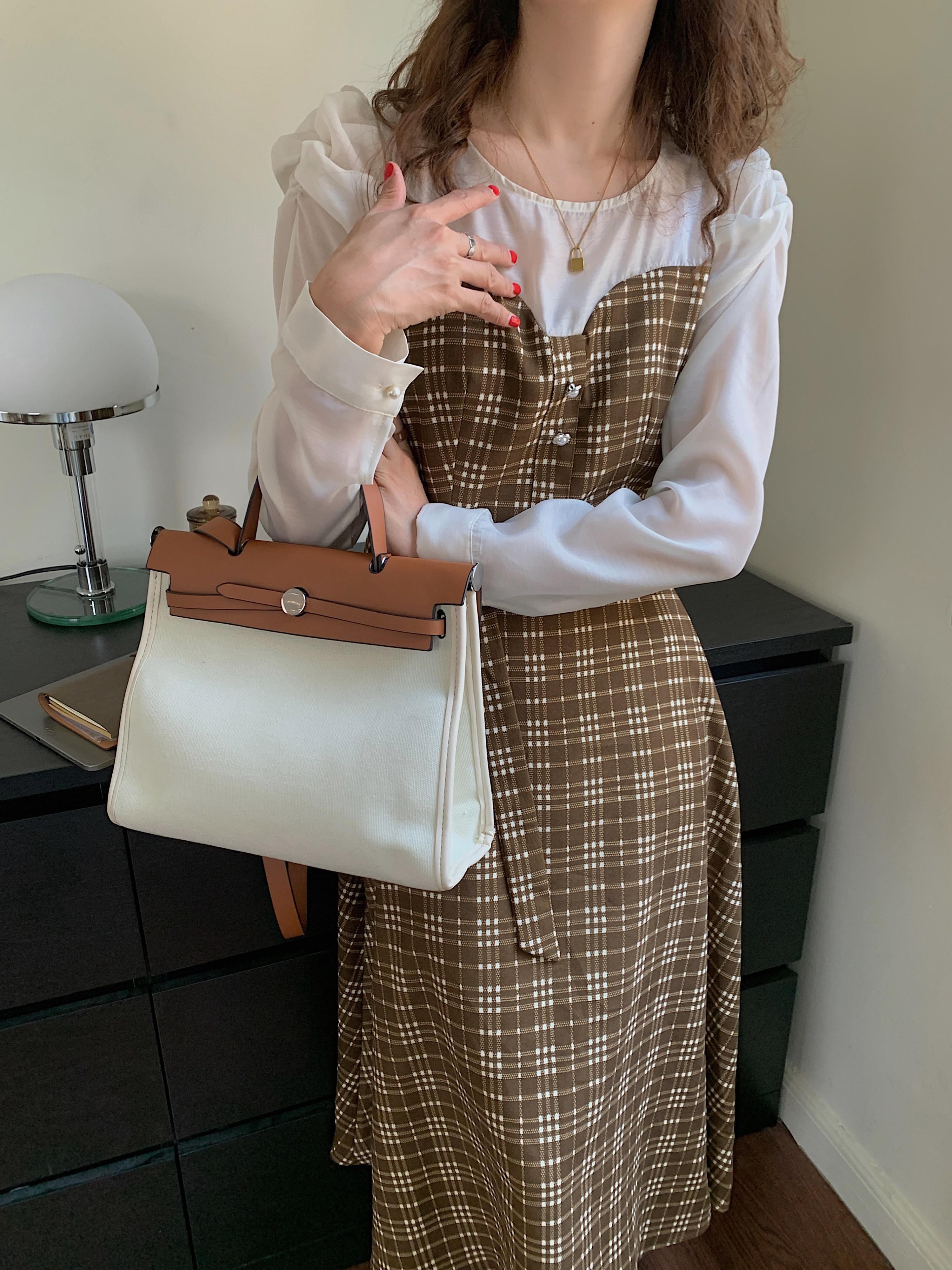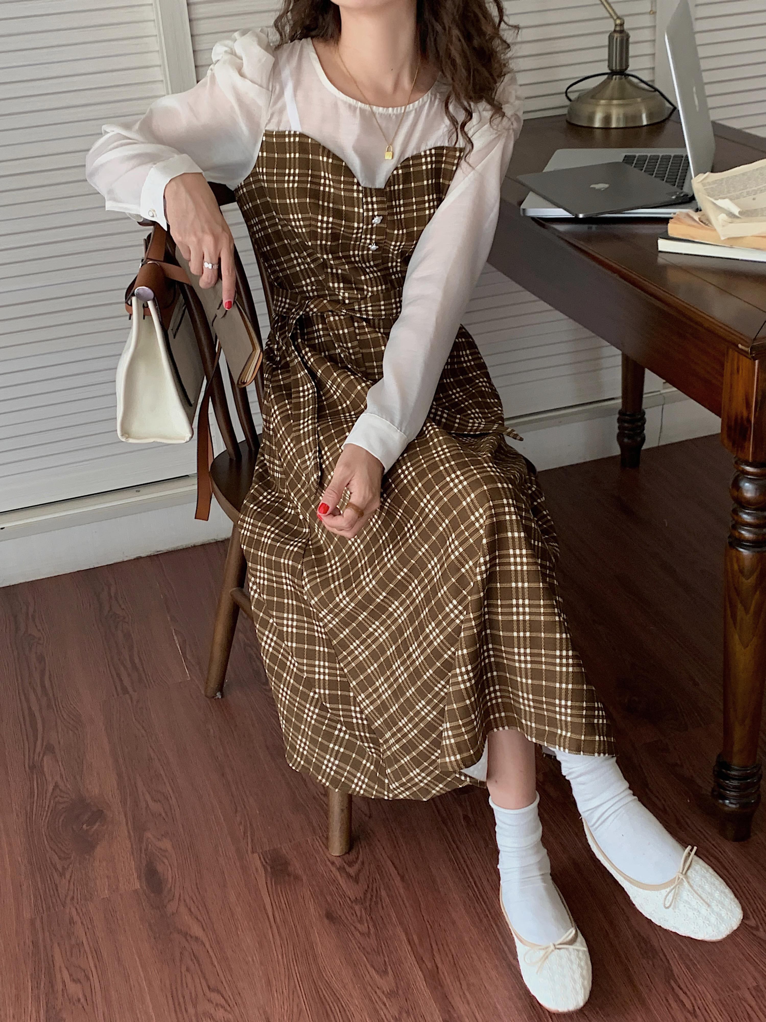 オータムラウンドネックシフォン格子柄ワンピースドレス 秋物 Oネック ステッチ 韓国婦人94095789178