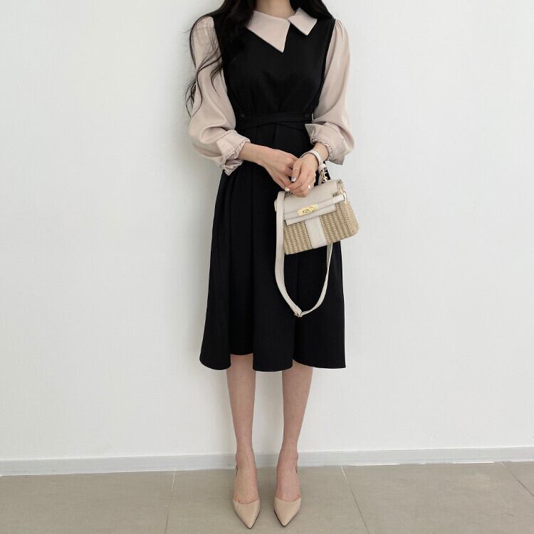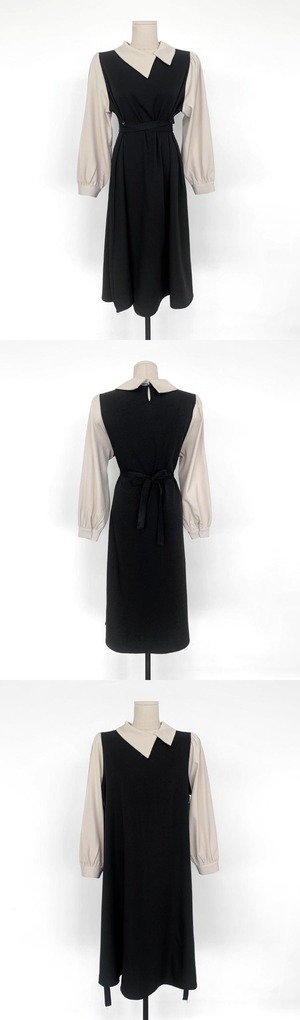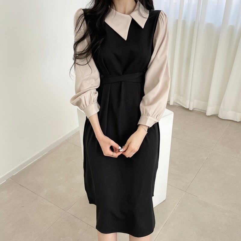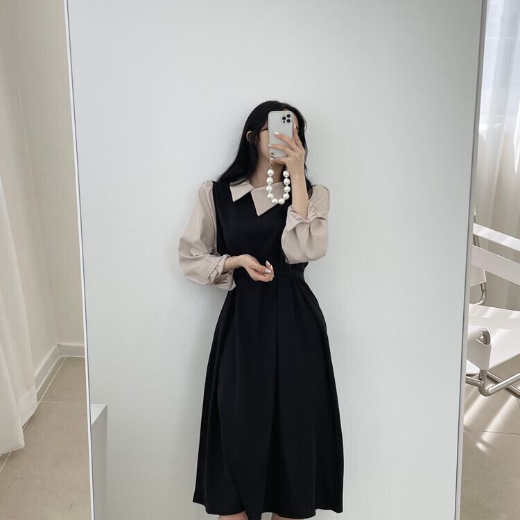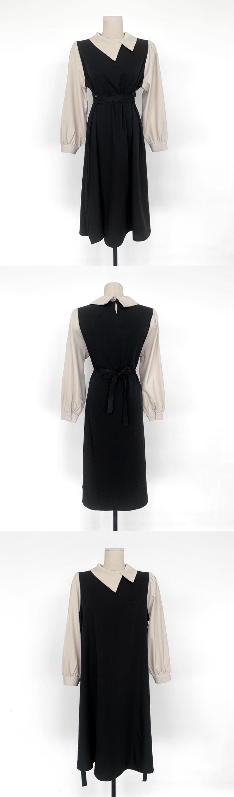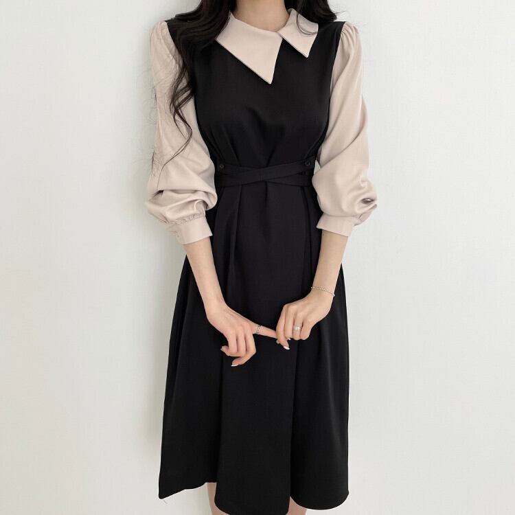 オータムスタンダードスタイルアシンメトリースリーブウェストカラードレス レディース レトロ 秋物 韓国婦人15586243804