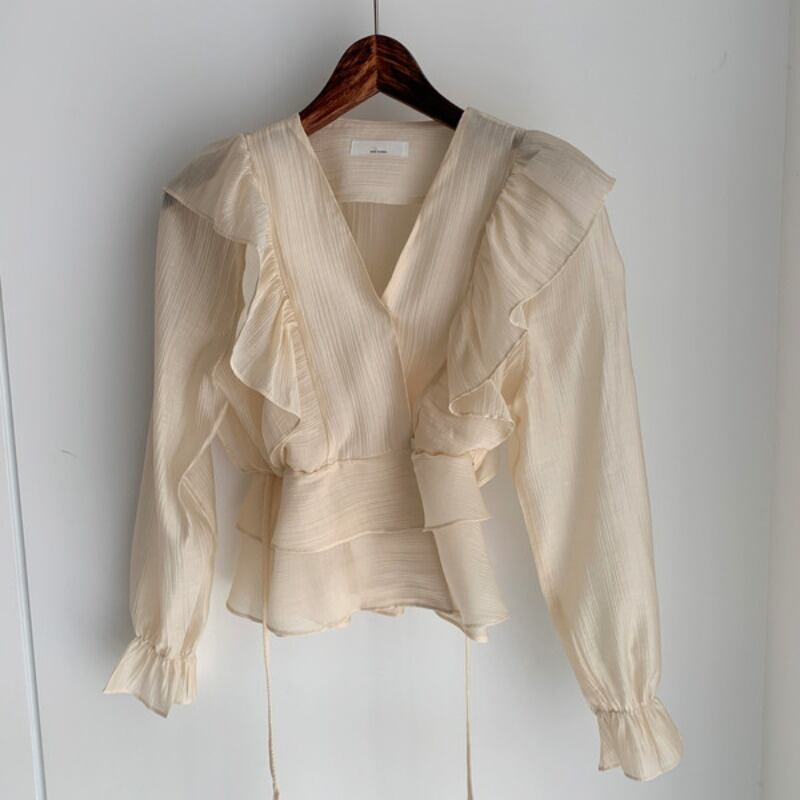 サマースタンダードVネックシャツ ウェスト薄手シフォンブラウス レディース レトロ 夏物 韓国婦人62517887036