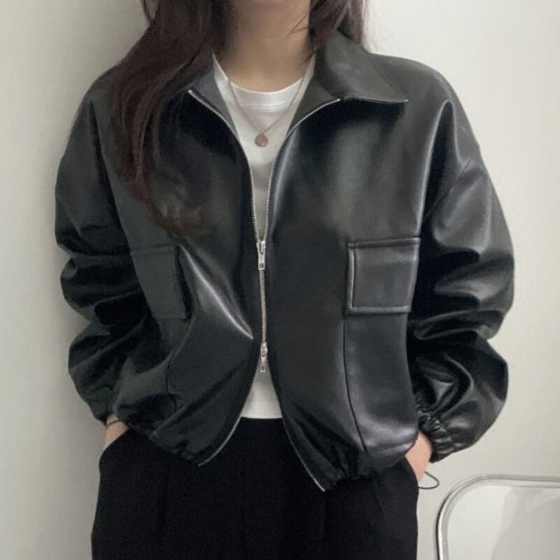 オータムウィンタースタンダードダブルポケットカジュアルルーズショートブラックレザージャケット レトロ 秋物 冬物 韓国婦人90555512750