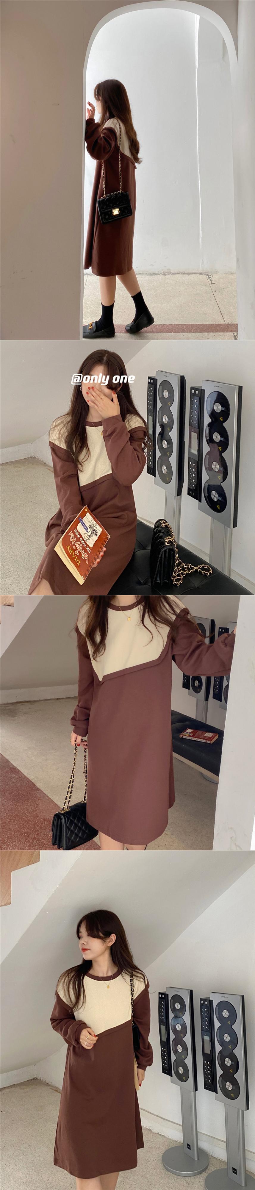 オータムウィンタースタンダードネイビーカラールーズドレス レディース ロング レトロ 秋物 冬物 ステッチ 韓国婦人13936867682