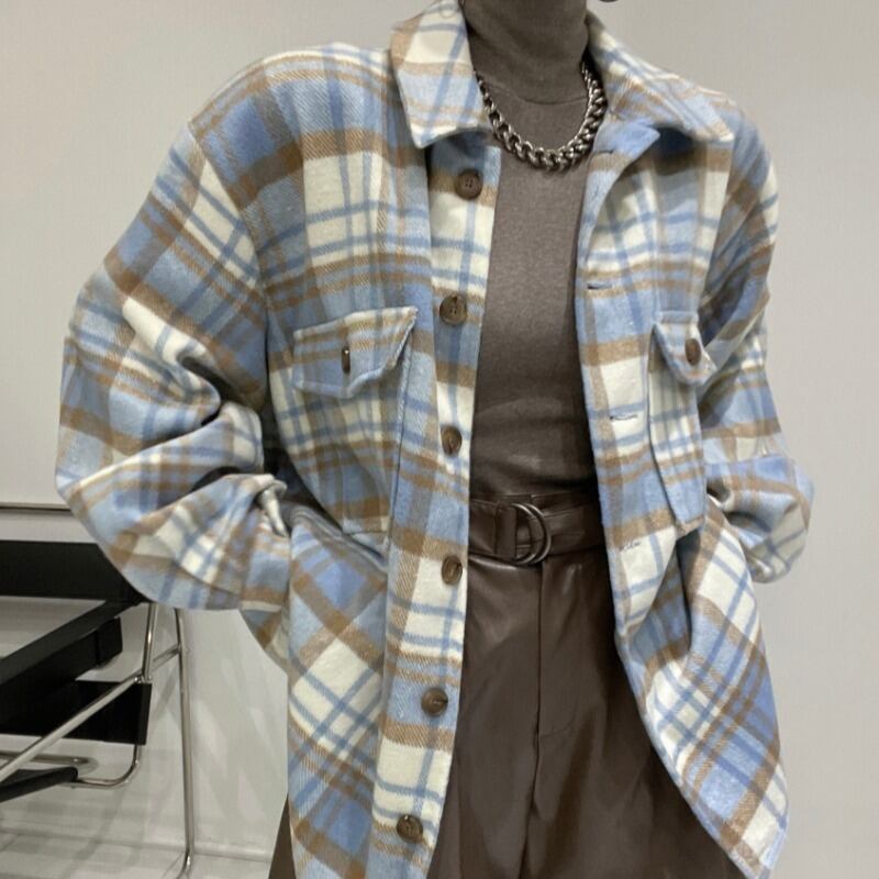 オータムスタンダードスタイルルーズ格子柄シャツ トップス レディース レトロ 秋物 韓国婦人63900008310