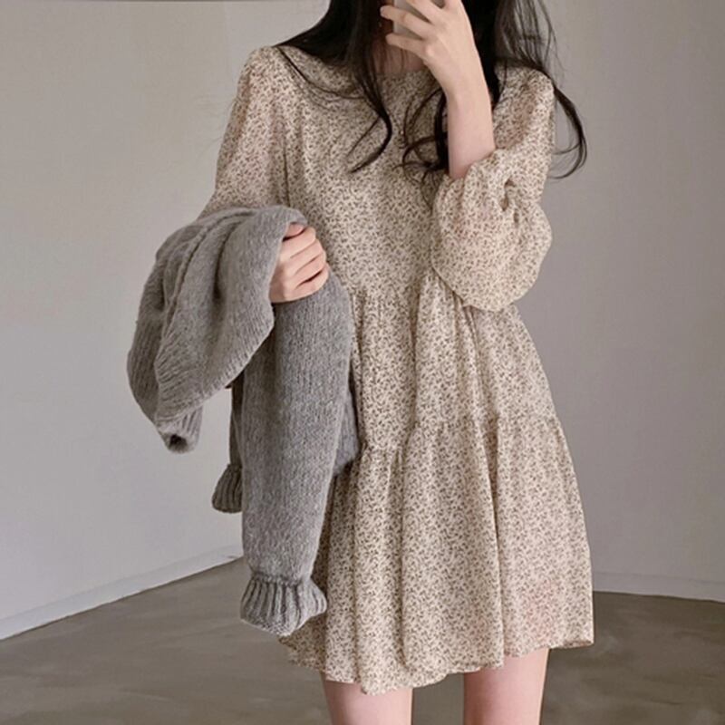 オータムスタンダードフローラルルーズラウンドネック長袖スリーブシフォンドレス レディース ロング レトロ 秋物 花柄 Oネック 韓国婦人67970165381