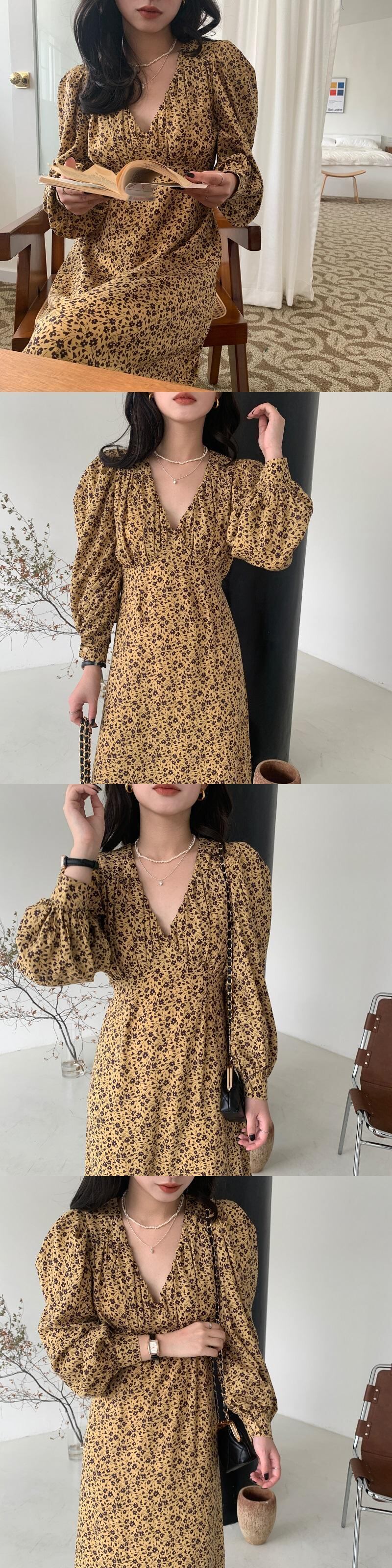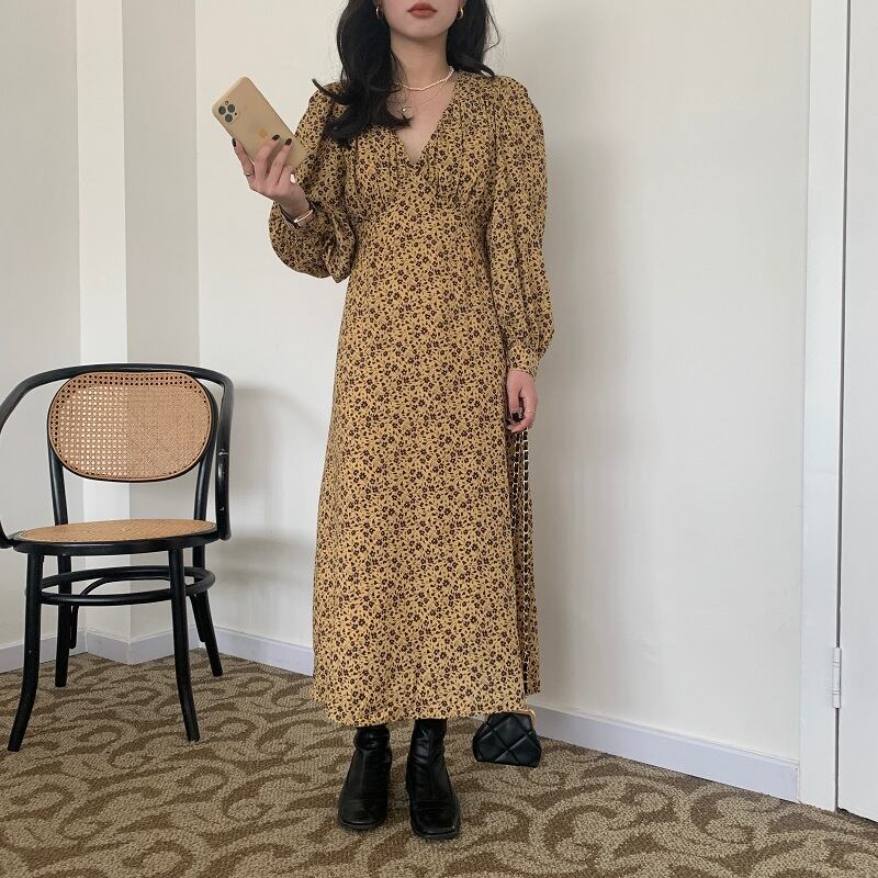オータムウィンタースタンダードVネックルーズスリーブロングフローラルドレス レディース レトロ 秋物 冬物 花柄 韓国婦人14719745846