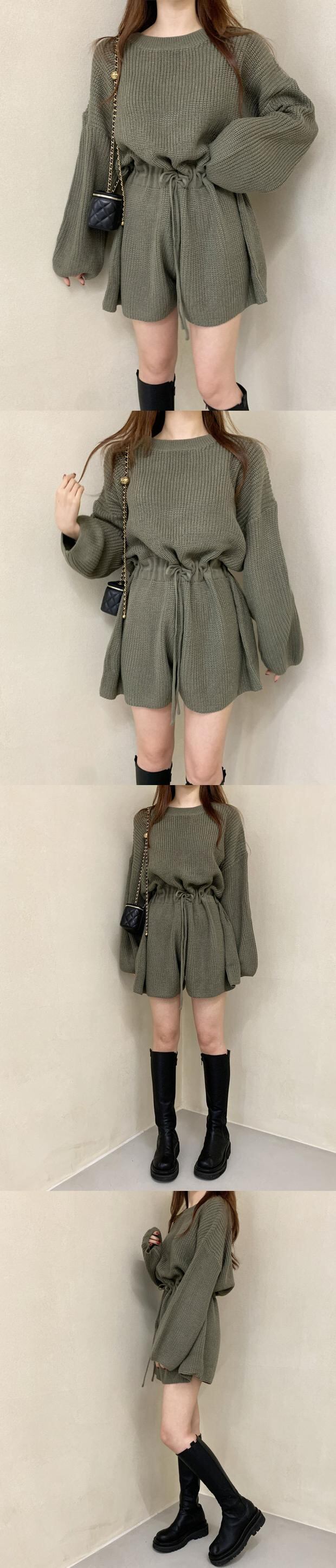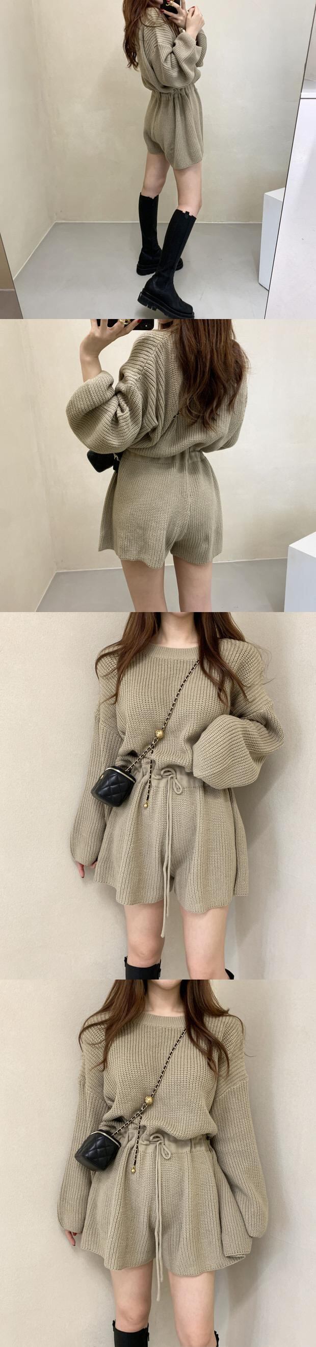 オータムスタンダードラウンドネックギャザーウェストニットセーター ジャンプスーツ オールインワン ショーツ レディース ロング レトロ 秋物 ブルマー Oネック 韓国婦人77471235132