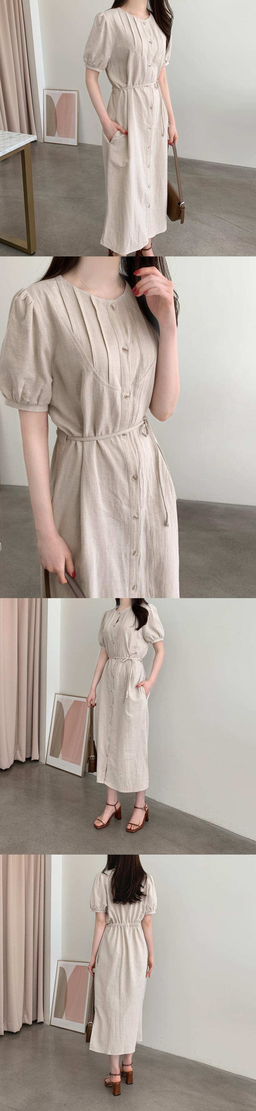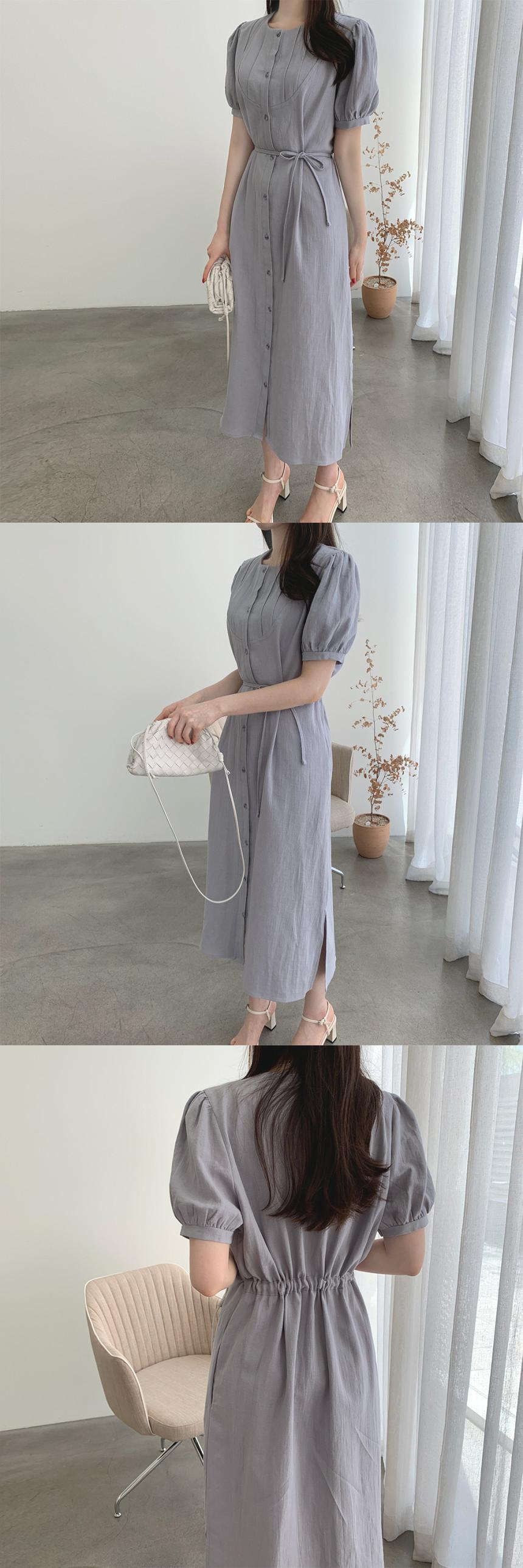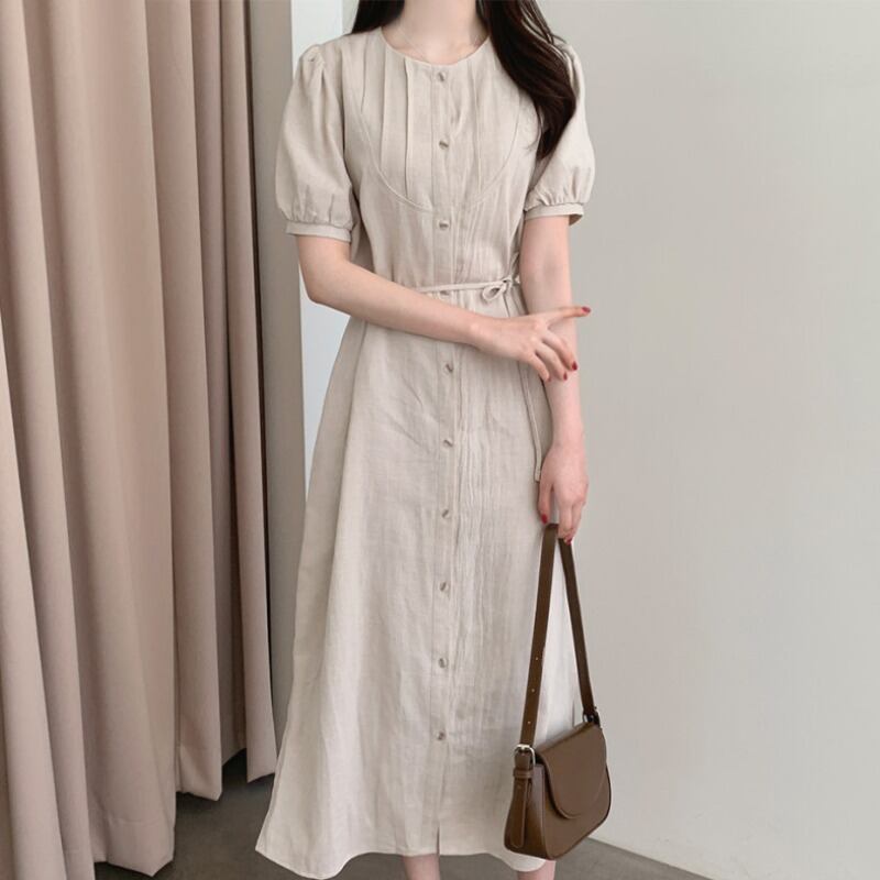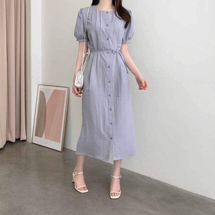 ラウンドネックプリーツスリーブドレス レディースサマーウェストロングスカート エレガント 夏物 Oネック 韓国婦人88229756284