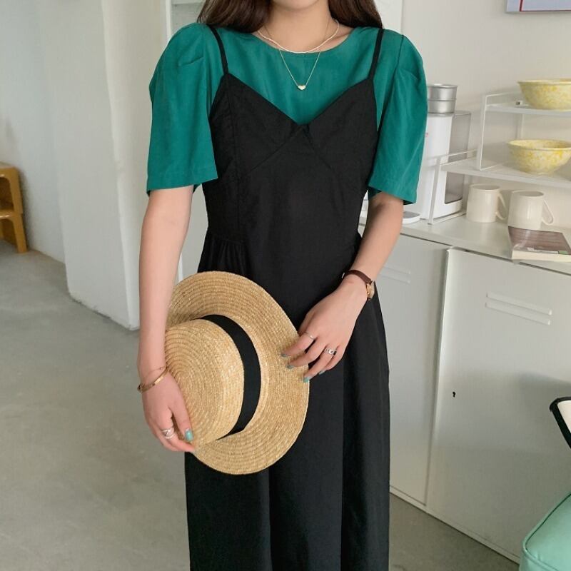 サマースリーブトップス プリーツVネックドレス レディース 夏物 韓国婦人29100906583