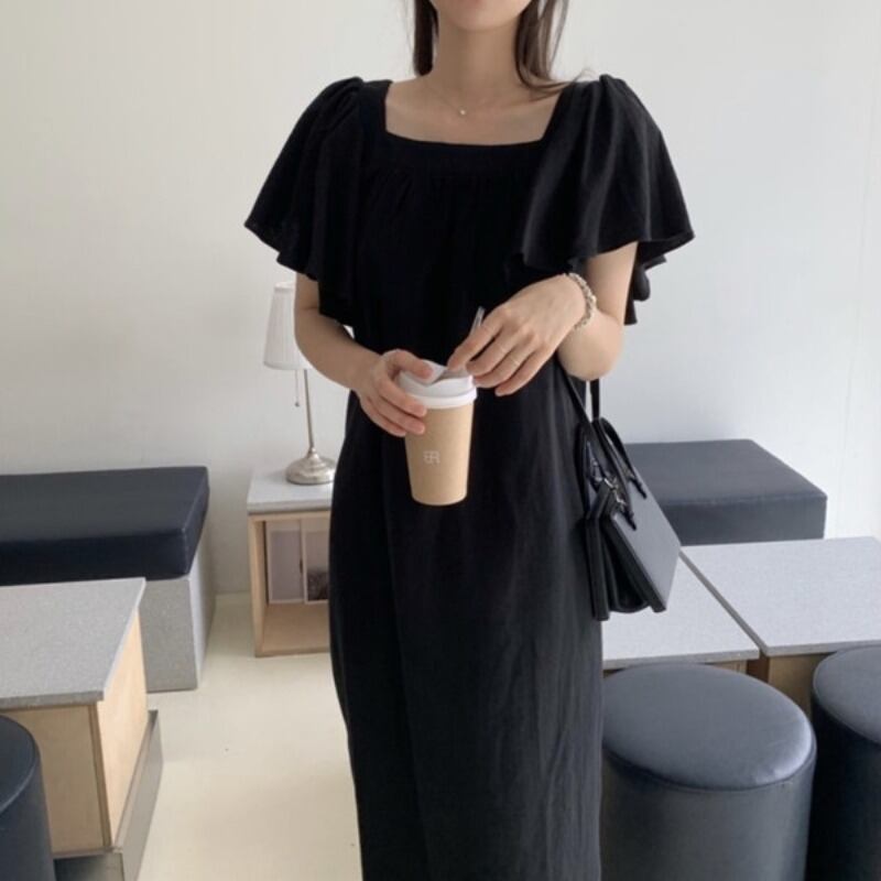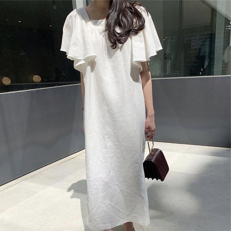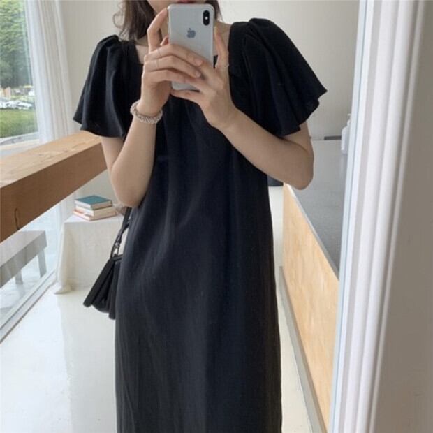 カラー薄手ルーズスリーブドレス サマーバックロングスカート 夏物 スクウェア 韓国婦人32045259692