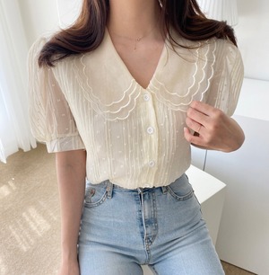 カラーシフォンシャツ レディースサマールーズブラウス レッド 刺繍 大人ガーリー スウィート キュート カジュアル 夏物 韓国婦人24430210042