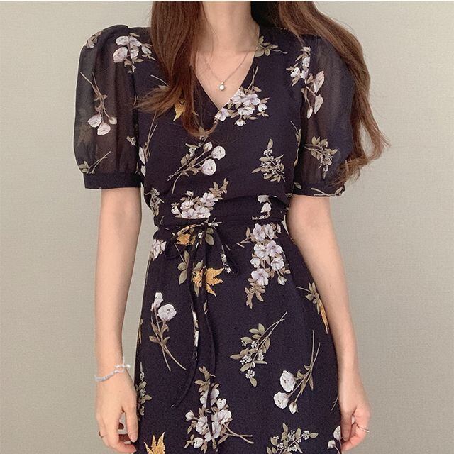 Vネックウェストスリーブロングスタンダードシフォンプリントドレス レディース レトロ 韓国婦人54137551120