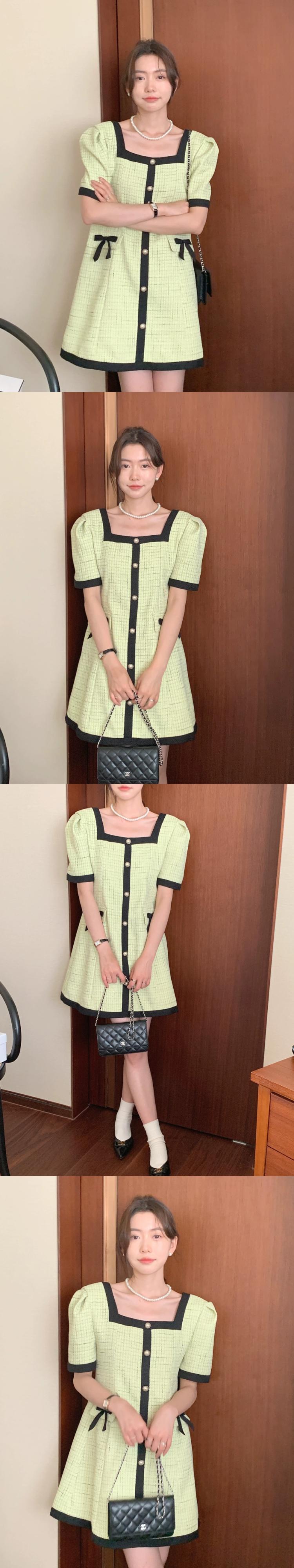 Xiaoxiangfeng コントラストカラースクエアネック半袖ドレス女性の夏フレンチスタイルシングルブレスト小さな A ラインショートスカート ハーフスリーブ サマー 夏物 Aライン スクウェア 韓国婦人47508791308