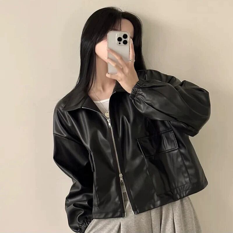 シックな秋と冬のニッチ気質ラペルレースアップ長袖レザージャケット女性小柄なショートジャケットトップ ロング オータム 秋物 ウィンター 冬物 韓国婦人39761607489