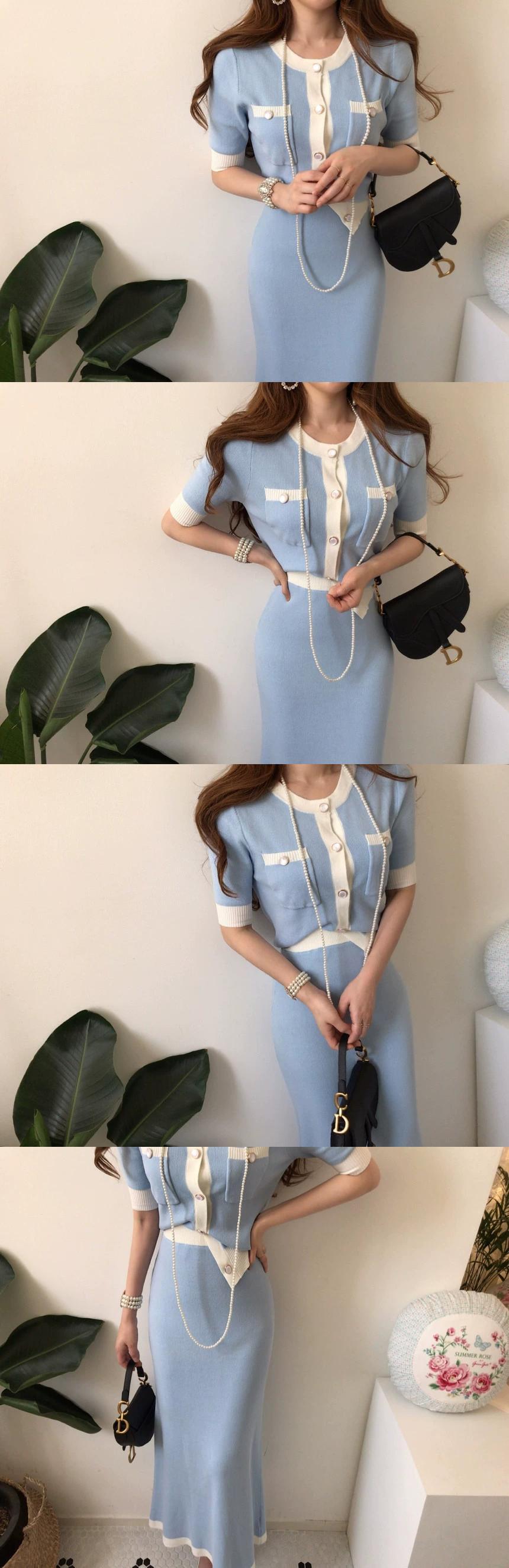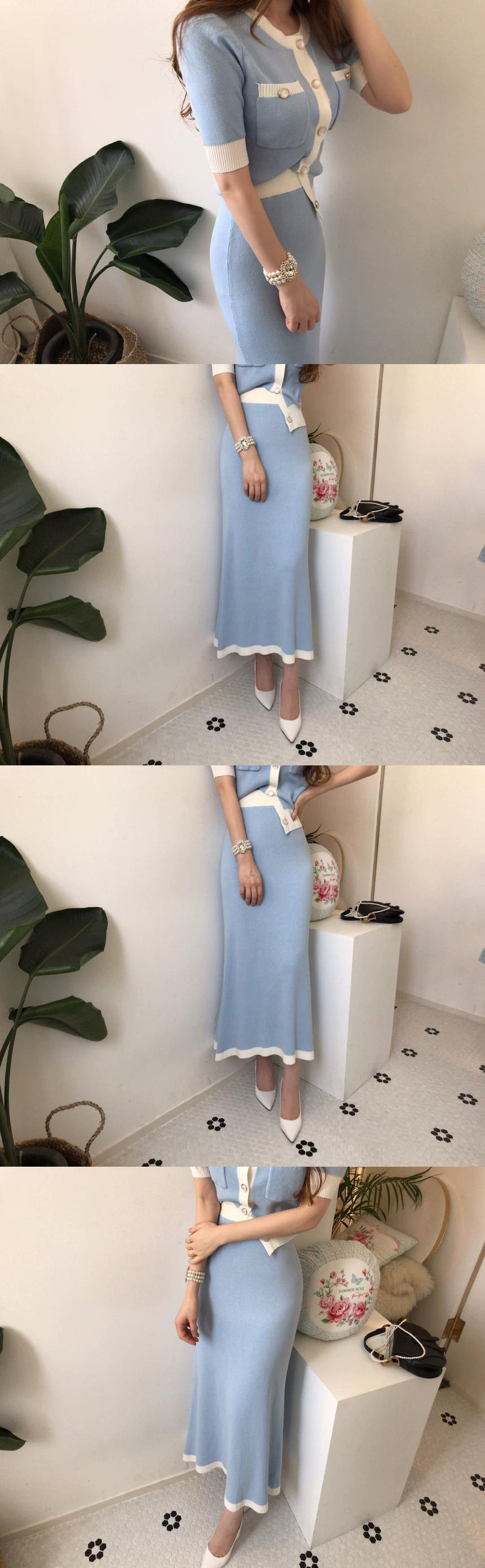 シックなカラーブロックのラウンドネックシングルブレスト半袖セーター+ハイウエストヒップスカートロングスカートスーツ Oネック 韓国婦人66163473939