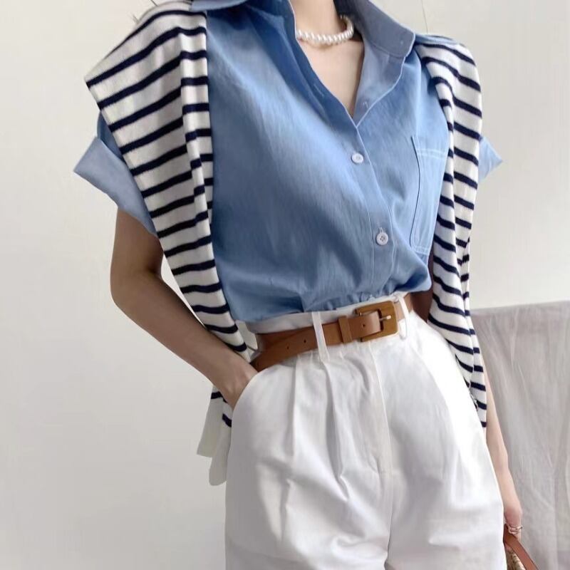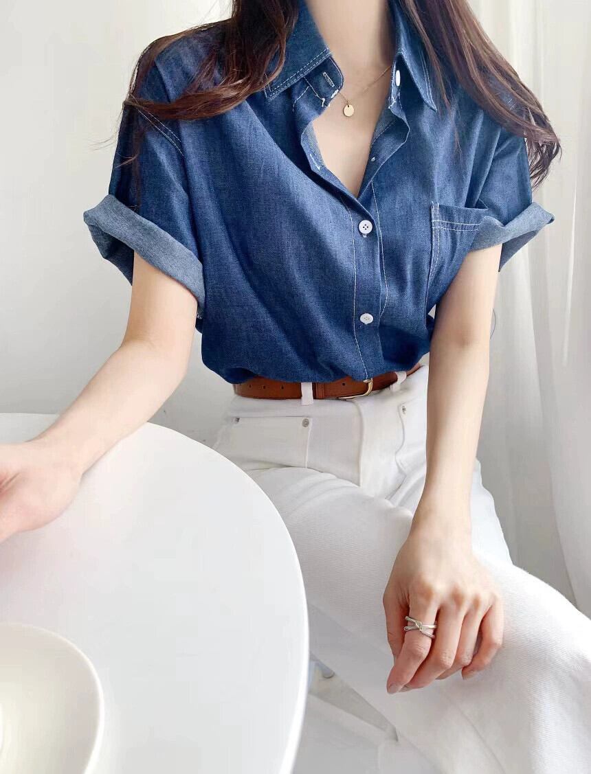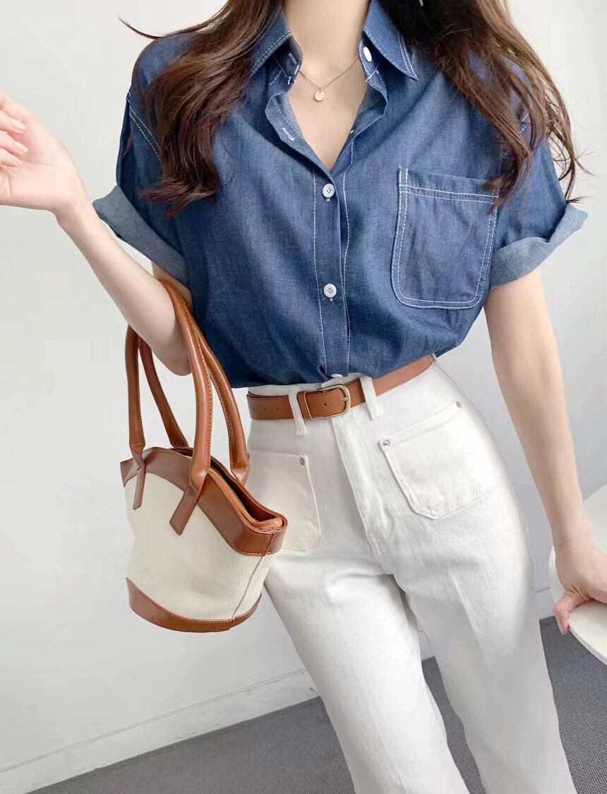 シックな新しい夏スタイル多用途デザインニッチ痩身老化防止デニムトップス多用途トップステッチシャツ女性 サマー 夏物 韓国婦人23257117998