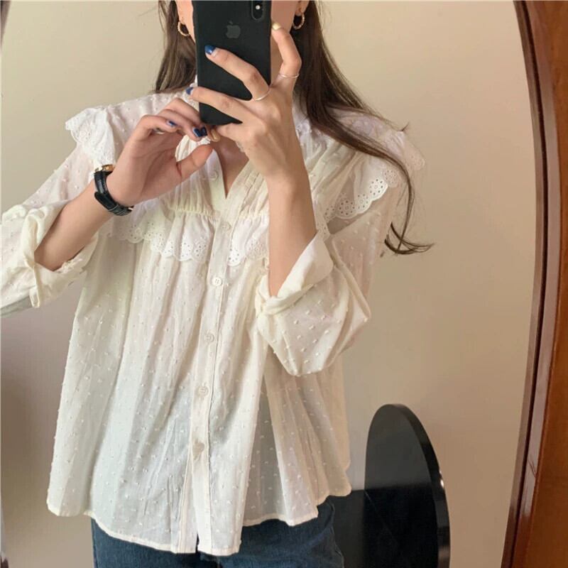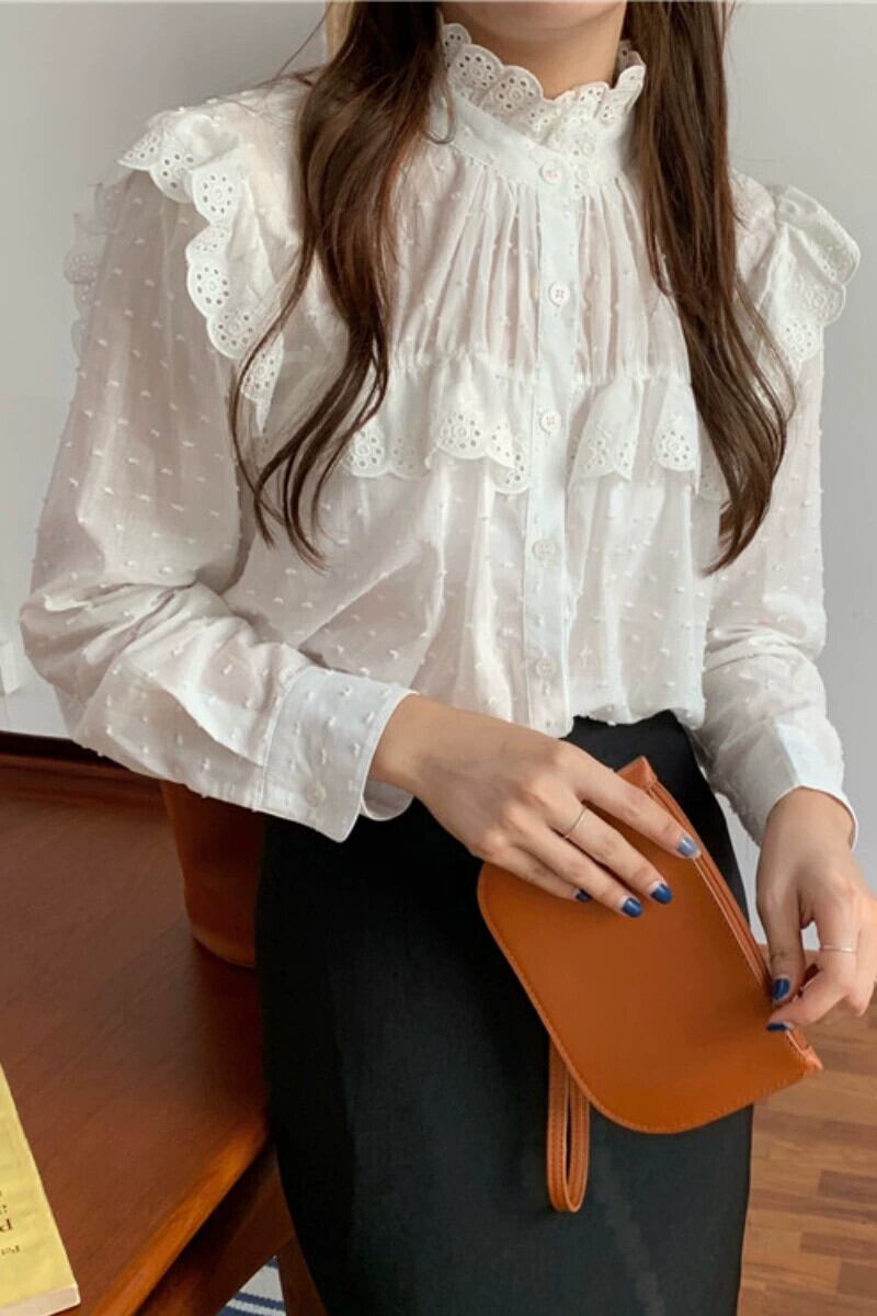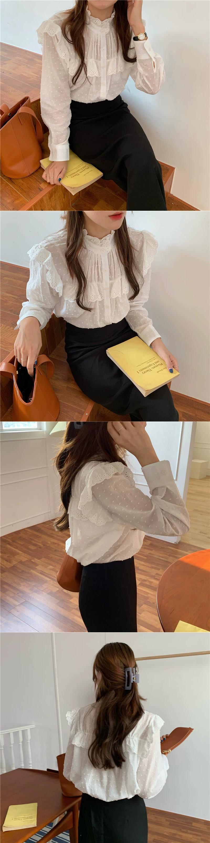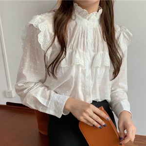 フレンチレトロ香港スタイル長袖シャツデザインニッチ春と秋香港スタイルルーズフリルスタンドカラートップ女性 ロング スプリング 春物 オータム 秋物 韓国婦人47983658123
