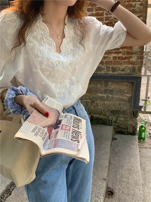 スタイル刺繍レース、優しく新鮮で多用途な夏のシャツ女性、軽くて大人なスタイルのフレンチVネックパフスリーブトップ レッド サマー 夏物 韓国婦人15398091777